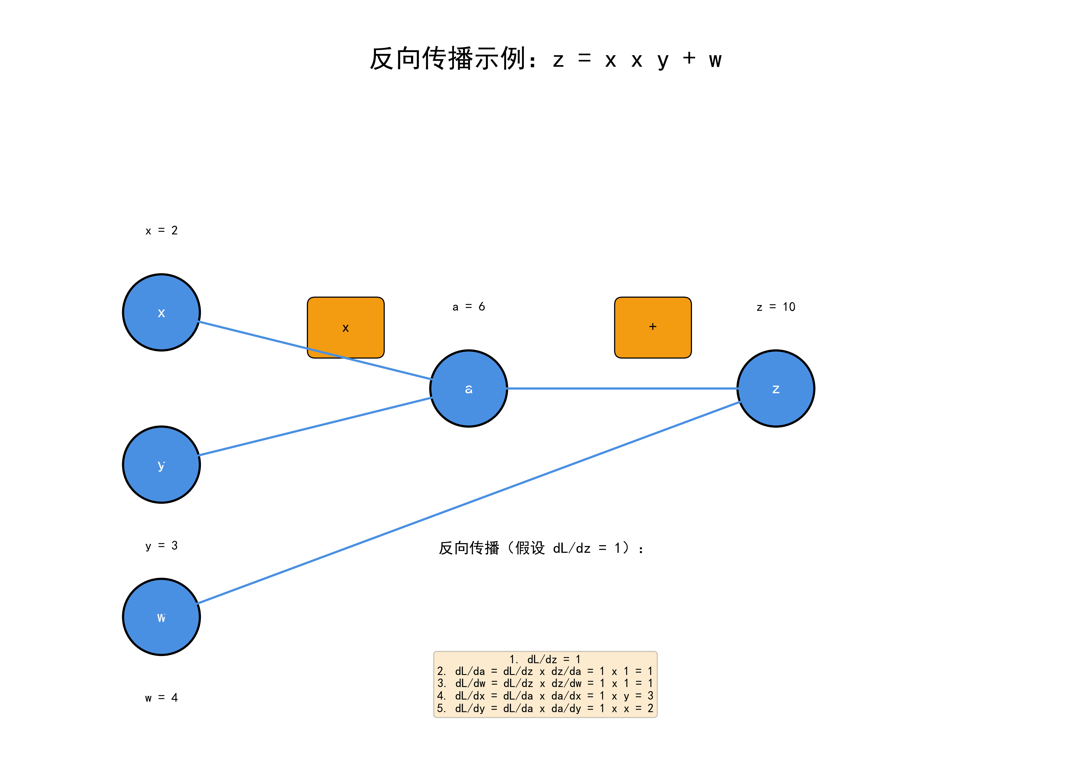 图注:反向传播的具体示例,展示如何通过链式法则计算梯度