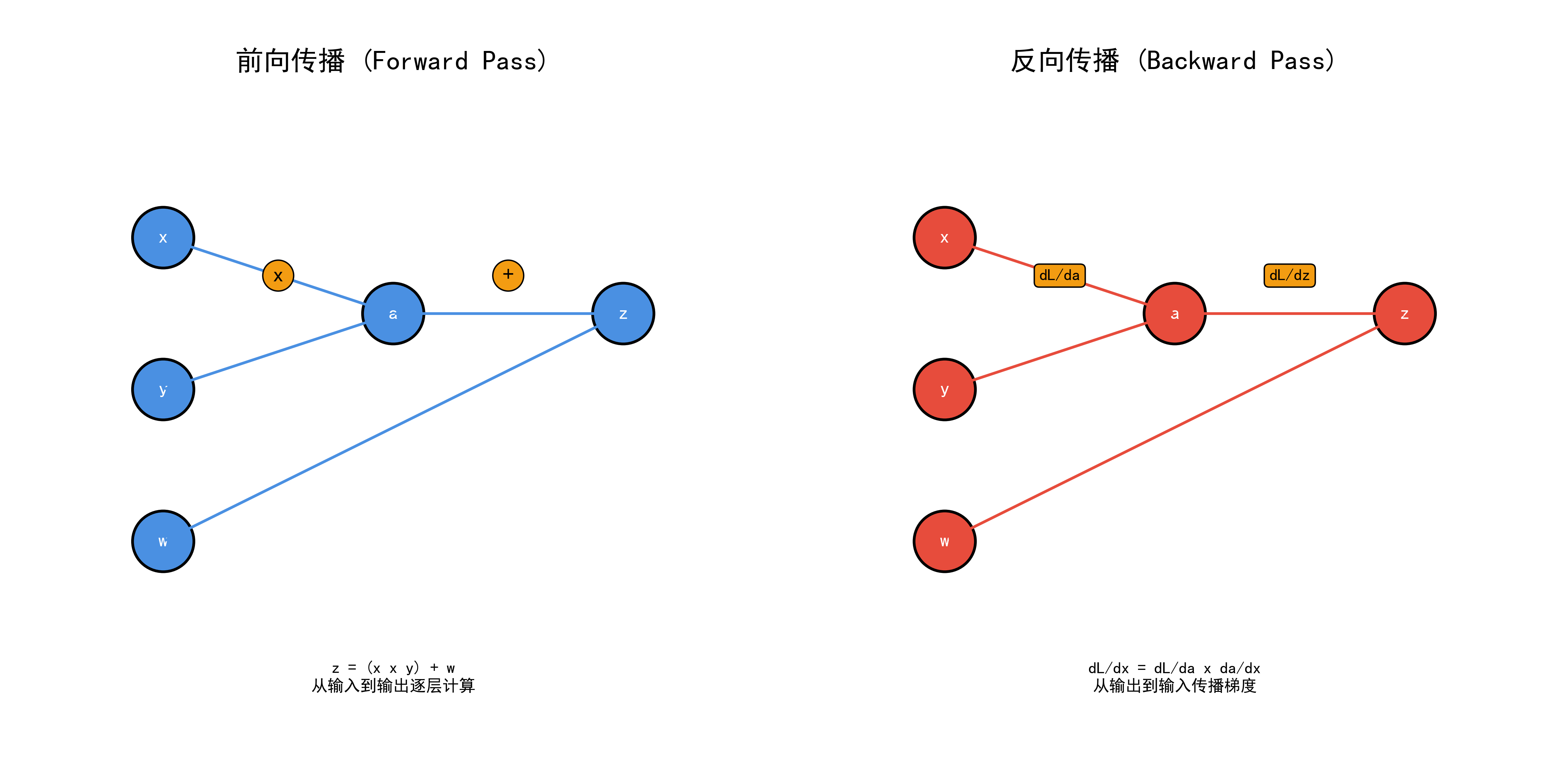 图注:计算图可视化,展示前向传播(数据流动)和反向传播(梯度流动)的对比