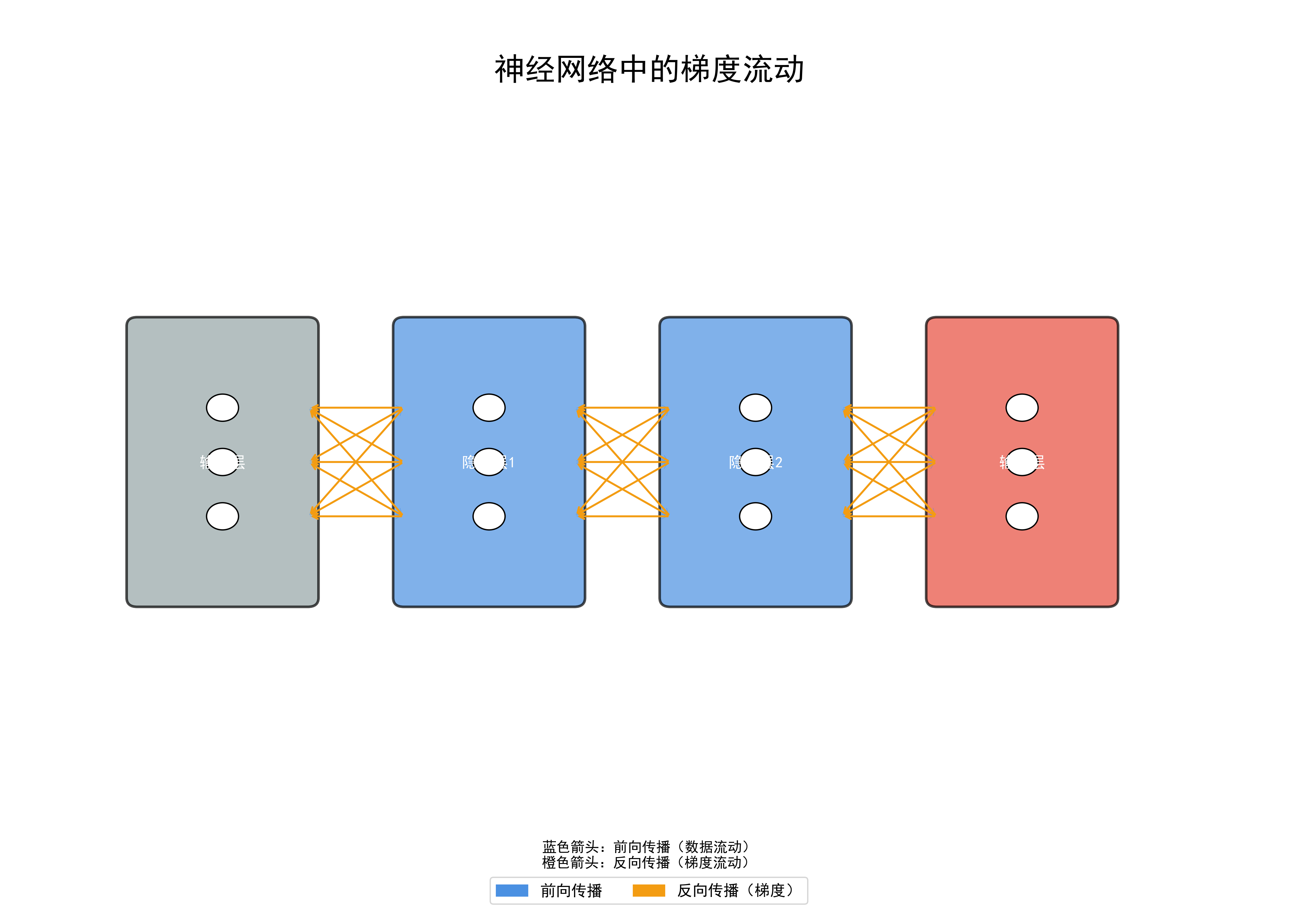 图注:神经网络中的梯度流动,蓝色箭头表示前向传播,橙色箭头表示反向传播(梯度流动)