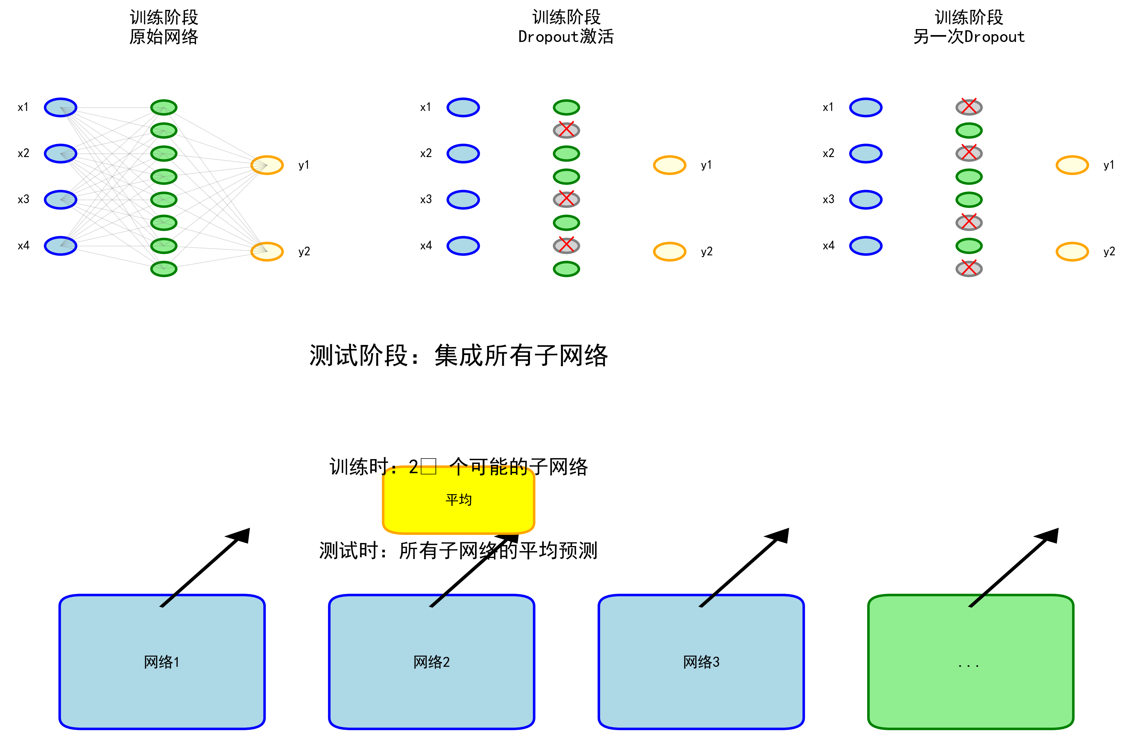 Dropout(Srivastava et al., 2014)是深度学习中最广泛使用的正则化技术之一。核心思想极其简单:在训练过程中,随机将一部分神经元的输出置零。