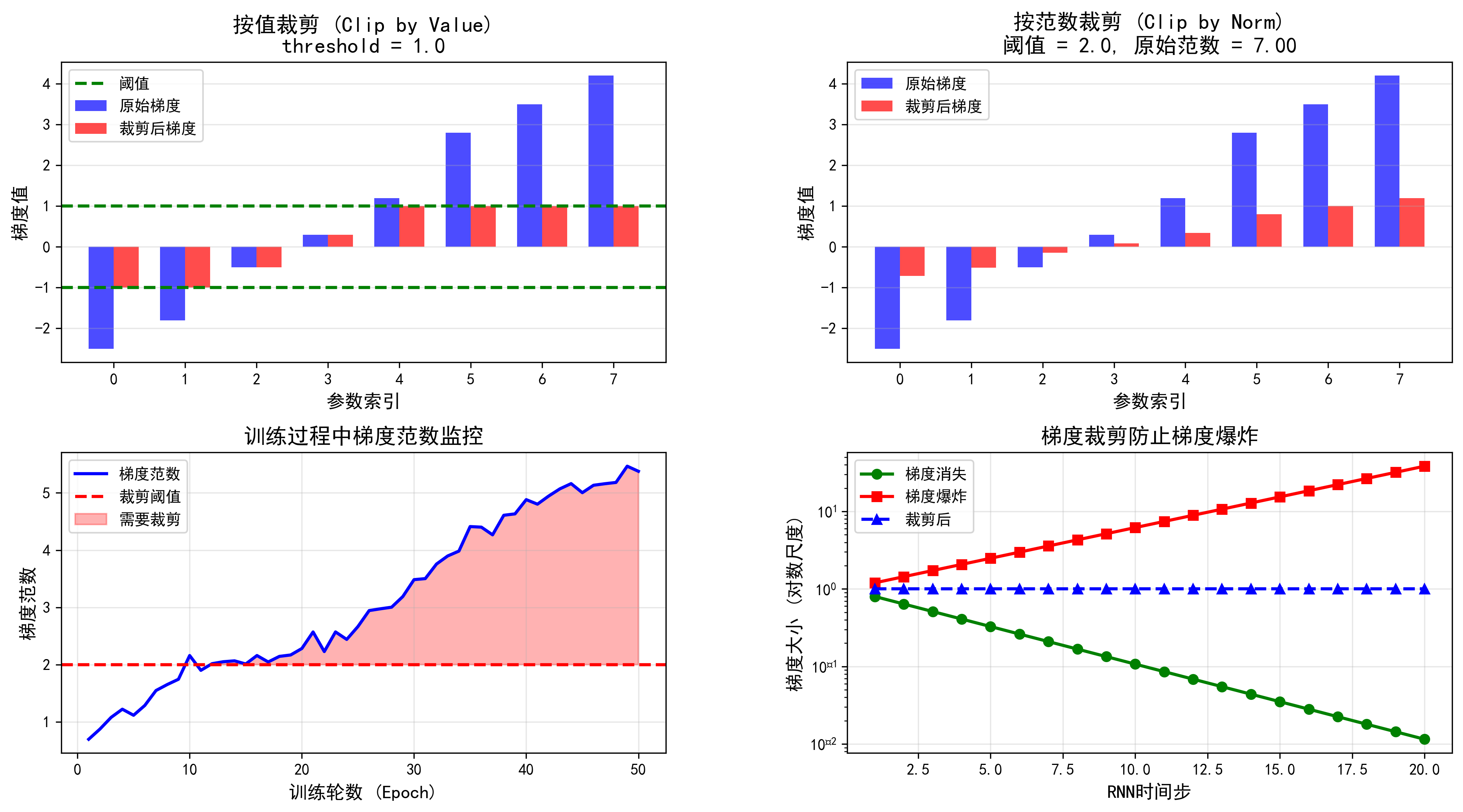 在训练深度网络(特别是 RNN)时,梯度可能变得非常大(梯度爆炸),导致训练不稳定。梯度裁剪通过限制梯度的大小来解决这个问题。