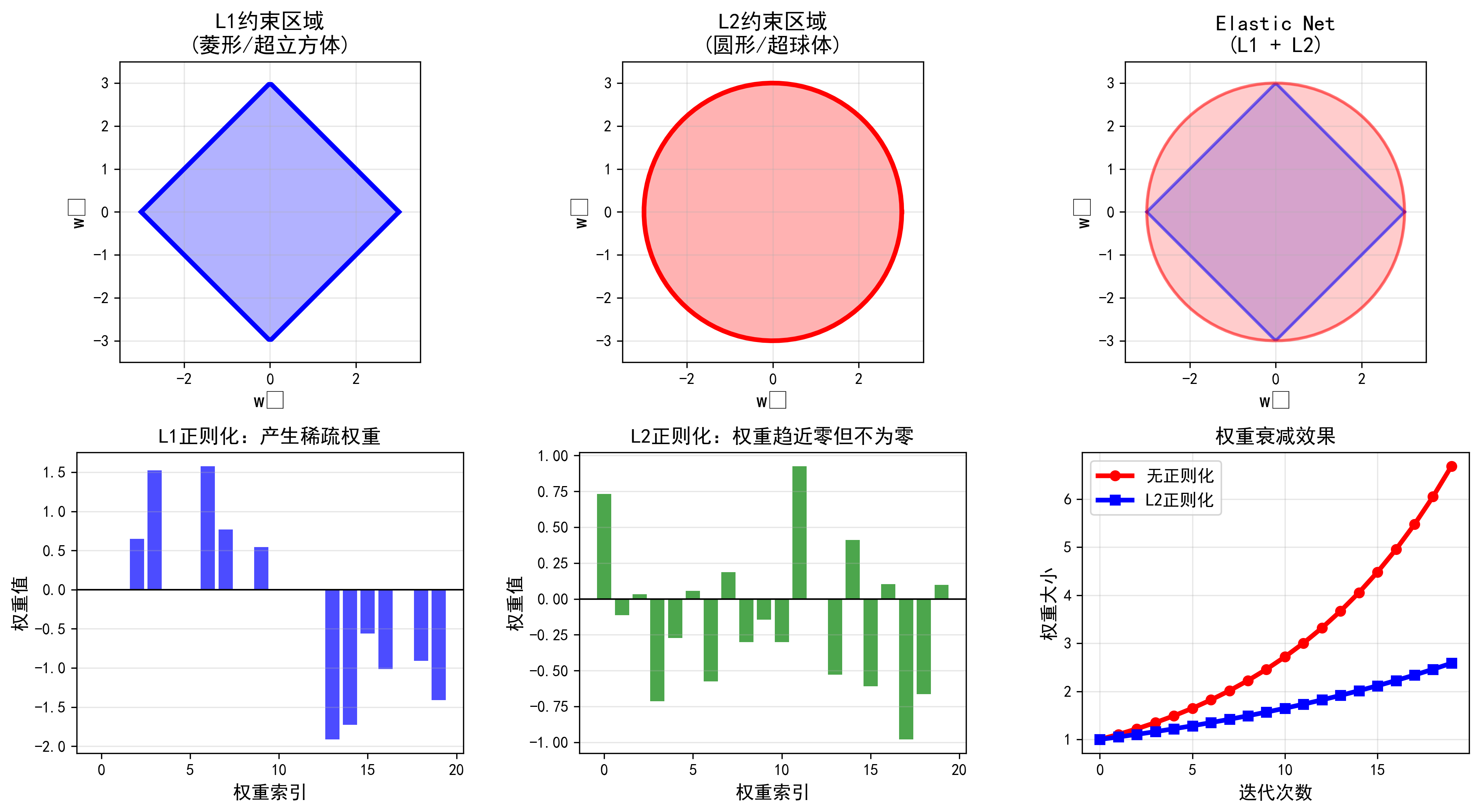 L1 正则化的特点 — 稀疏性:L1 正则化会将一些权重推向精确的零,从而产生稀疏模型。这是因为 L1 的约束区域是一个菱形(超立方体),等高线更容易在菱形的顶点处相切,而顶点处有某些坐标为零。