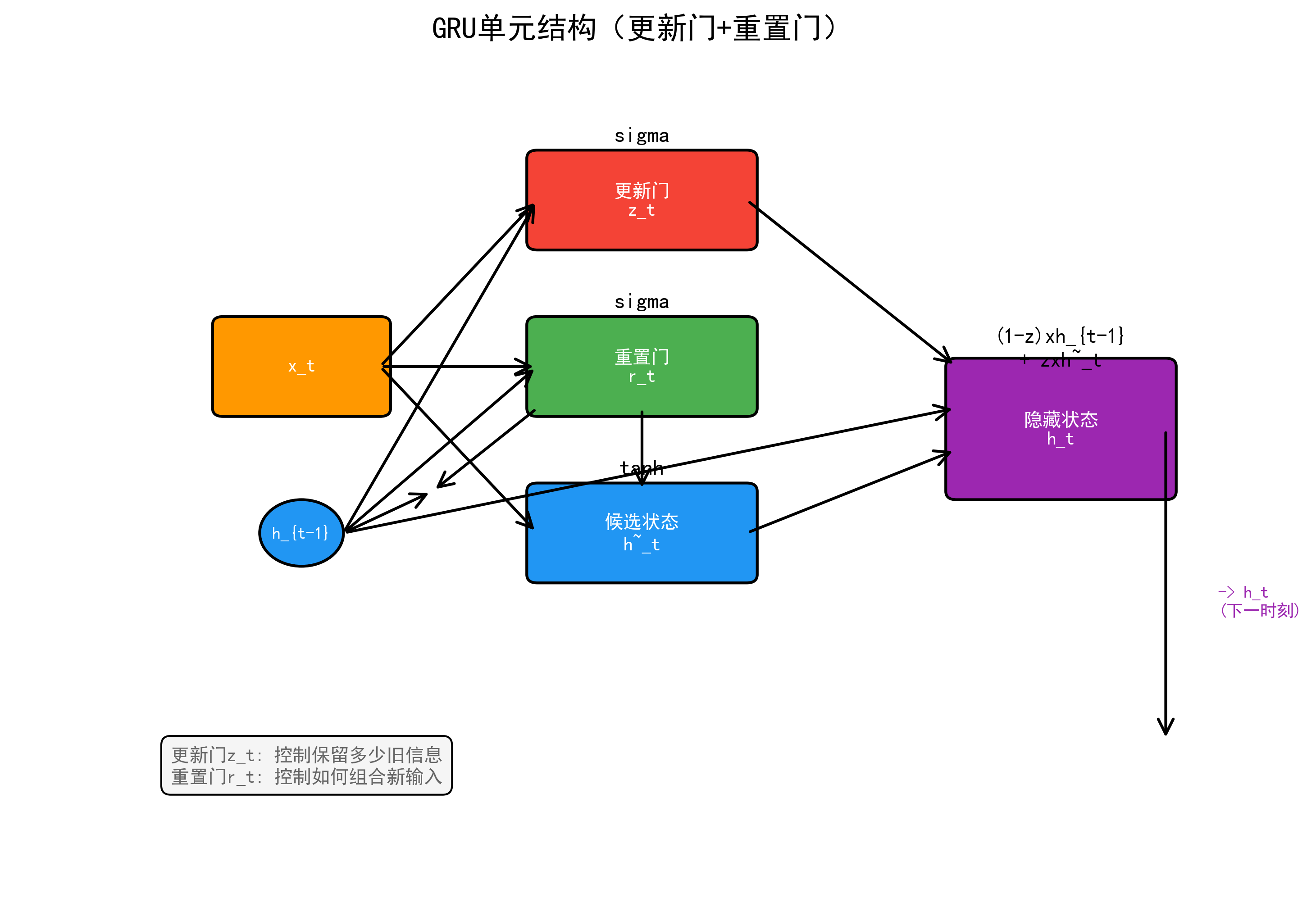 Q2: LSTM和GRU的主要区别? A: GRU用2个门(重置门+更新门)替代LSTM的3个门和细胞状态,参数量少25%,训练更快。GRU的更新门兼具LSTM遗忘门和输入门的功能。实际效果两者通常相当。
