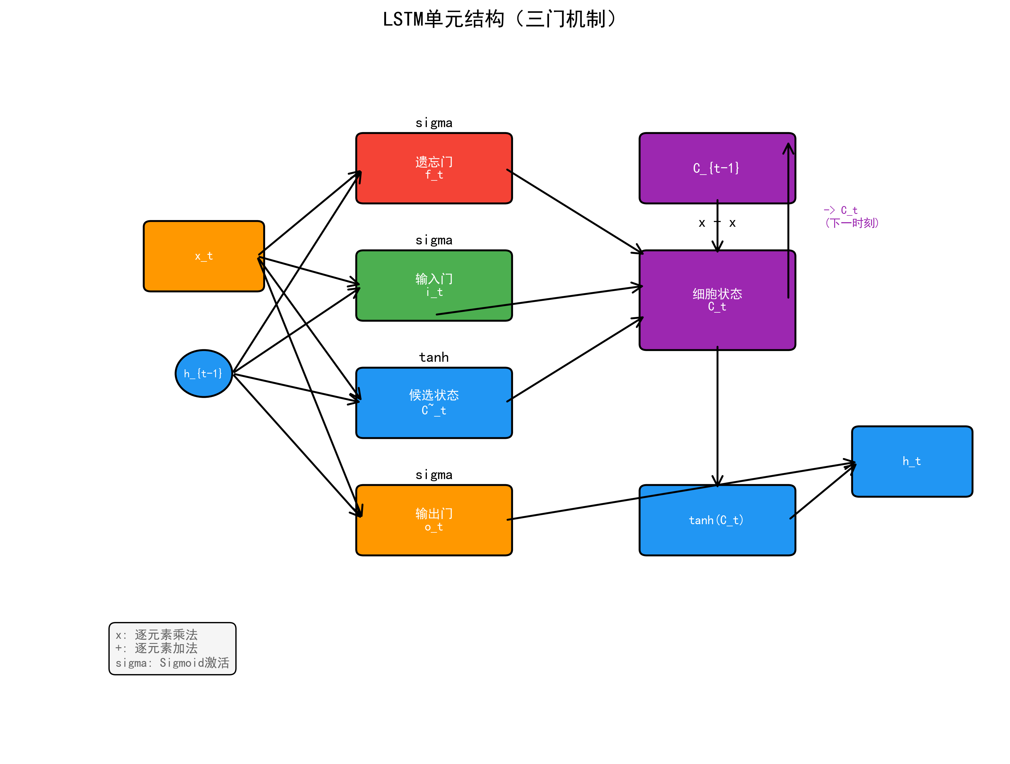 图注:LSTM单元结构,包含遗忘门、输入门、输出门和细胞状态