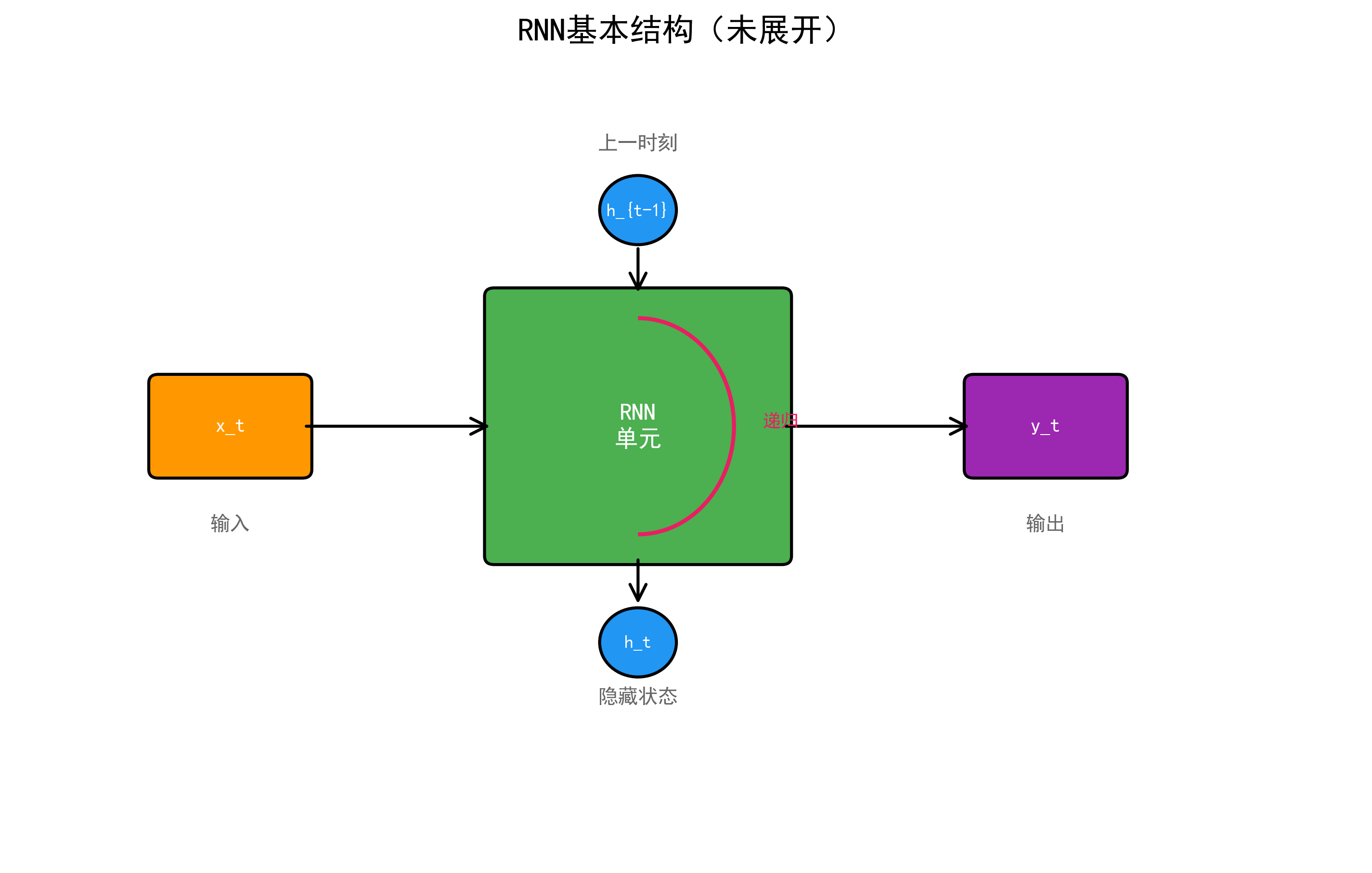 RNN通过隐状态递推实现:(1)处理任意长度序列;(2)参数在时间步间共享;(3)理论上可捕获任意长距离依赖。