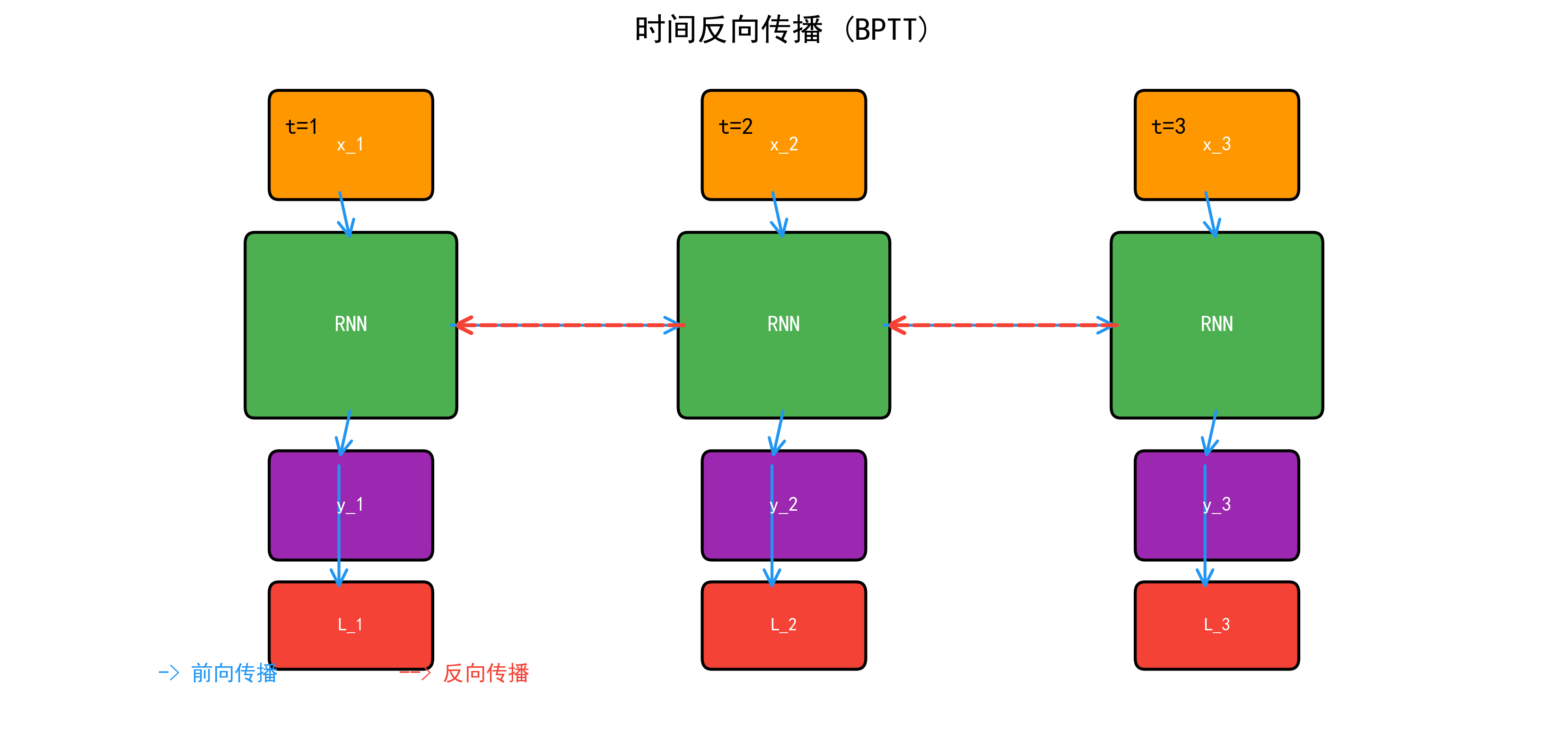 图注:时间反向传播(BPTT) - 蓝色箭头表示前向传播,红色虚线箭头表示反向传播