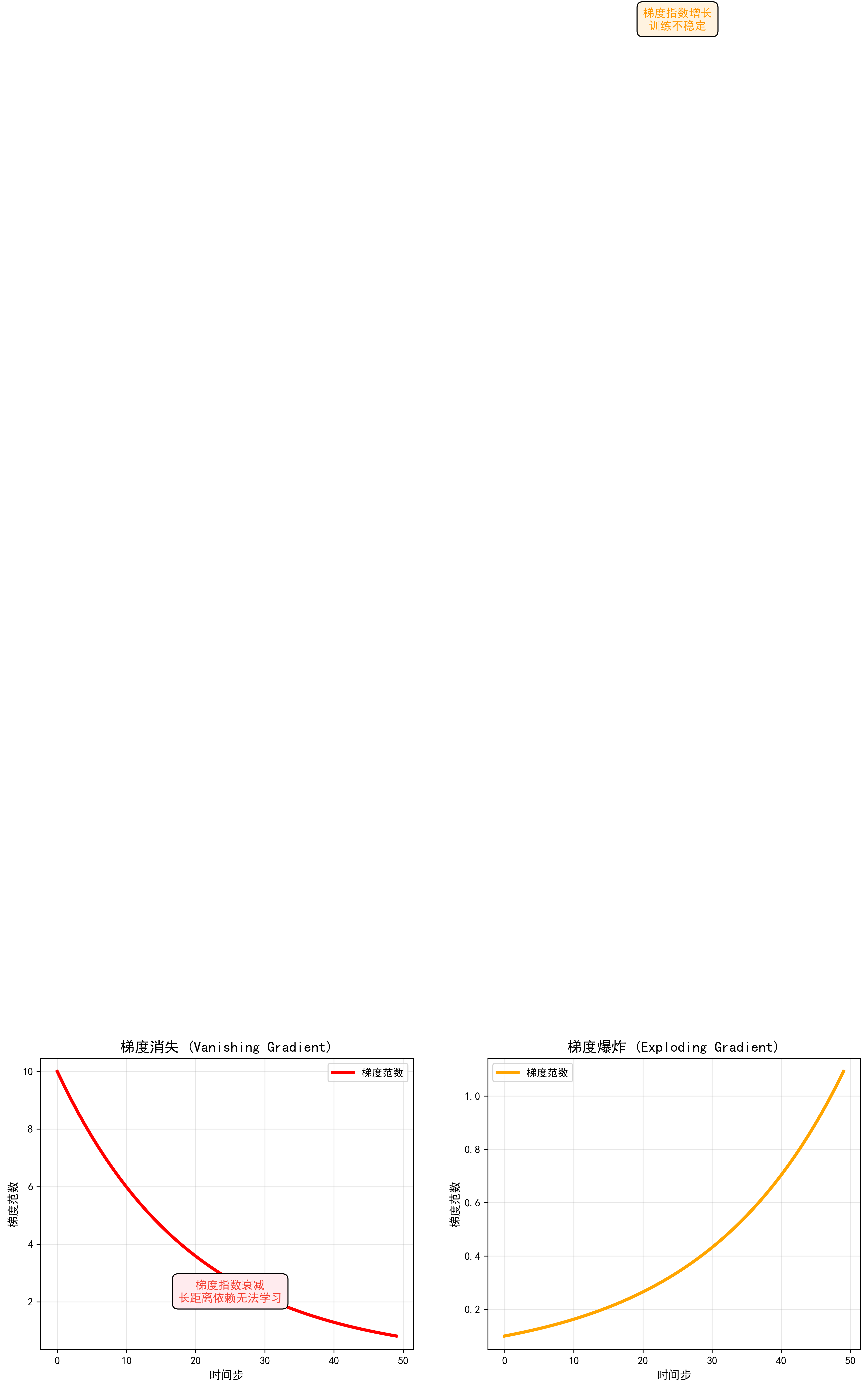 当 \(t - k\) 很大时: - 如果 \(\|\mathbf{W}_{hh}\|\) 的最大特征值 \(< 1\):梯度指数衰减 → 梯度消失 - 如果 \(\|\mathbf{W}_{hh}\|\) 的最大特征值 \(> 1\):梯度指数增长 → 梯度爆炸