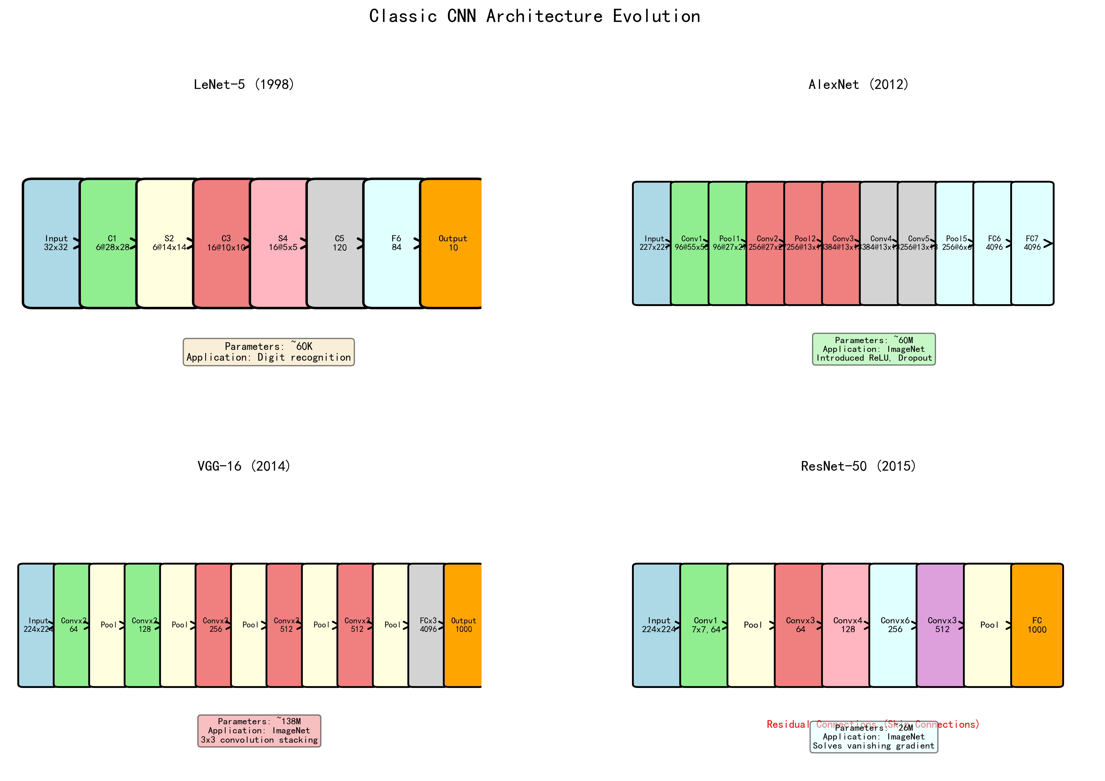 LeNet(1998) → AlexNet(2012) → VGG(2014) → GoogLeNet(2014) → ResNet(2015)