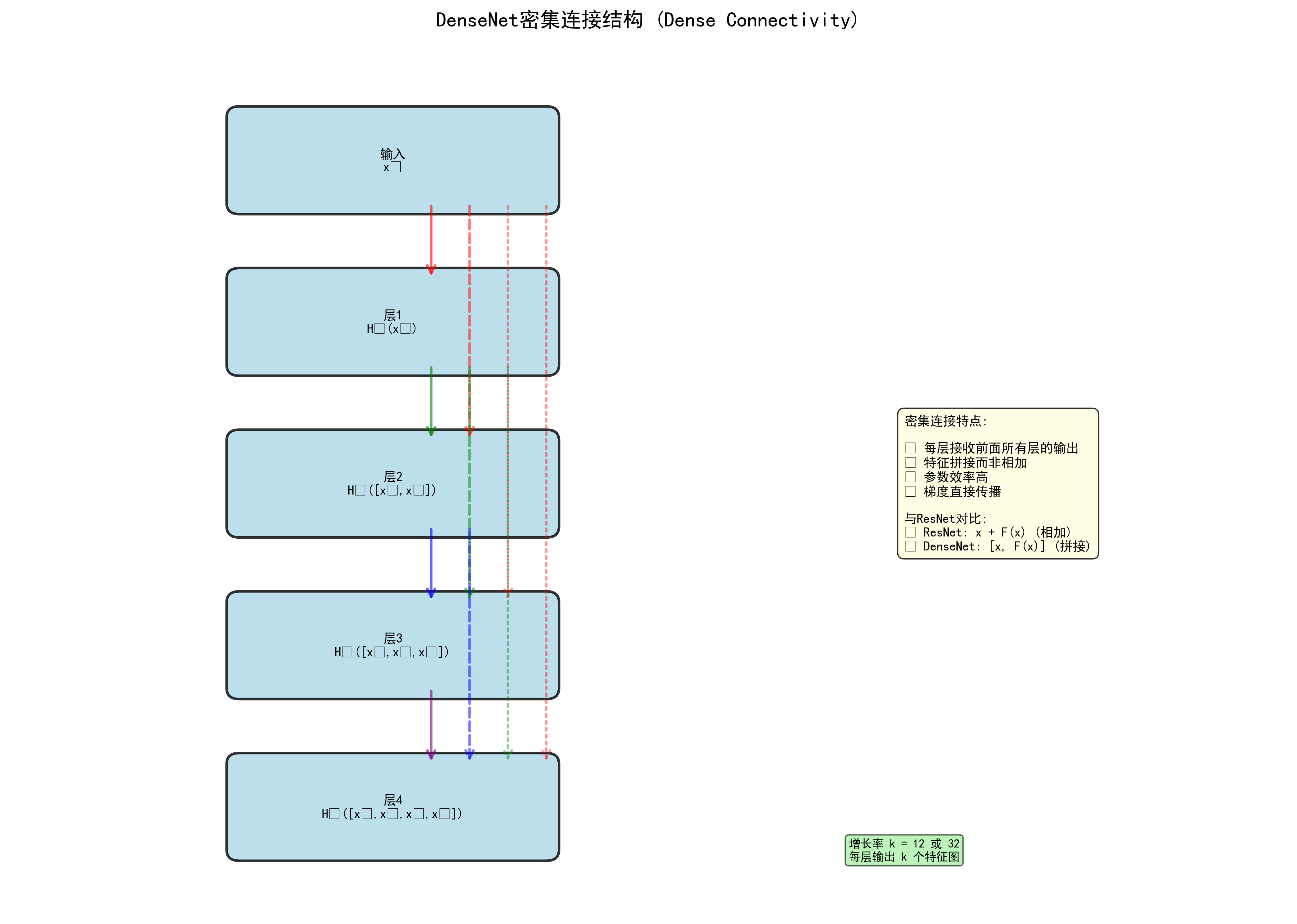 | DenseNet | 2017 | - | 121+ | 密集连接 |