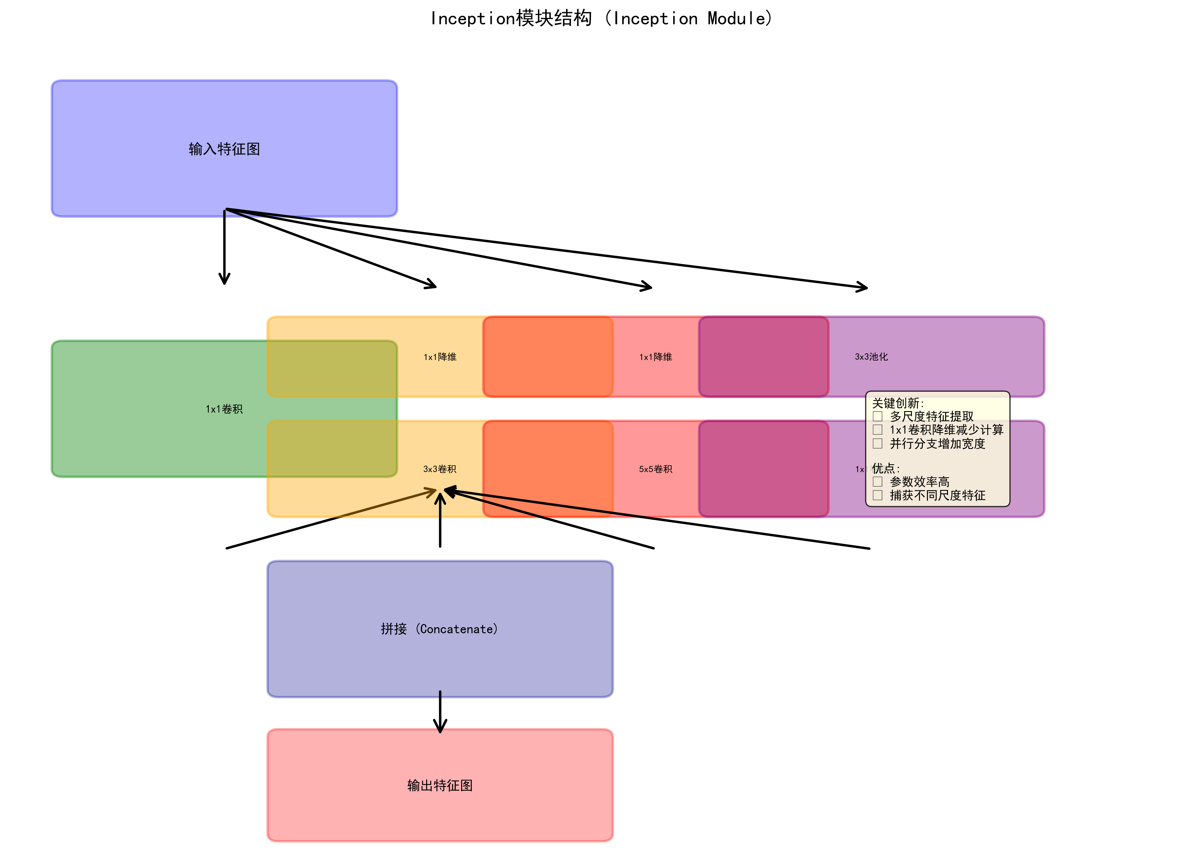 | GoogLeNet | 6.8M | 74.8% | Inception模块 | 多尺度特征 |