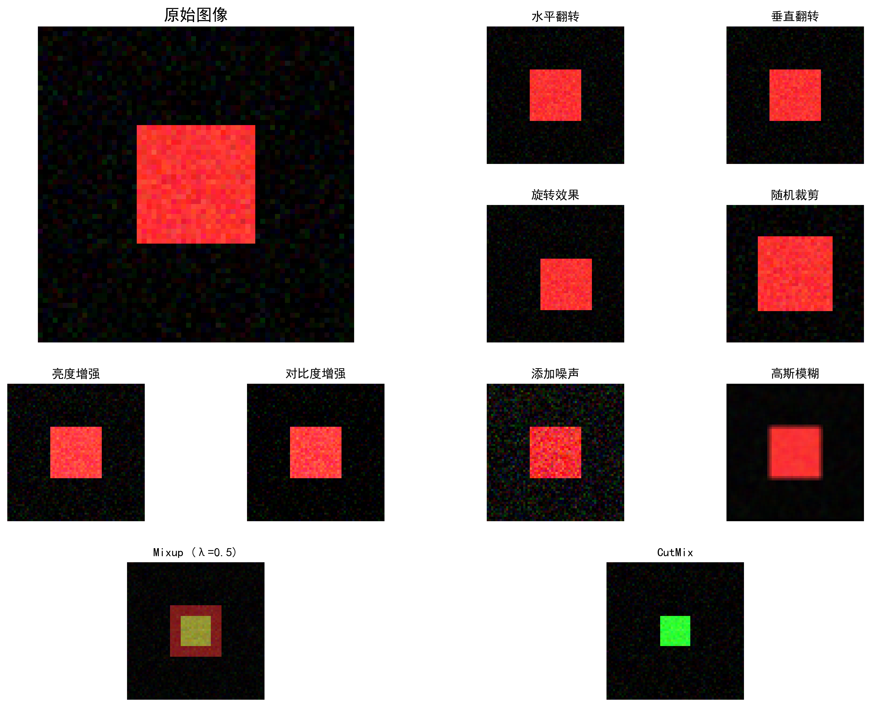 - 数据增强对比:在 CIFAR-10 上对比无增强、基础增强、RandAugment、Mixup、CutMix 的效果。