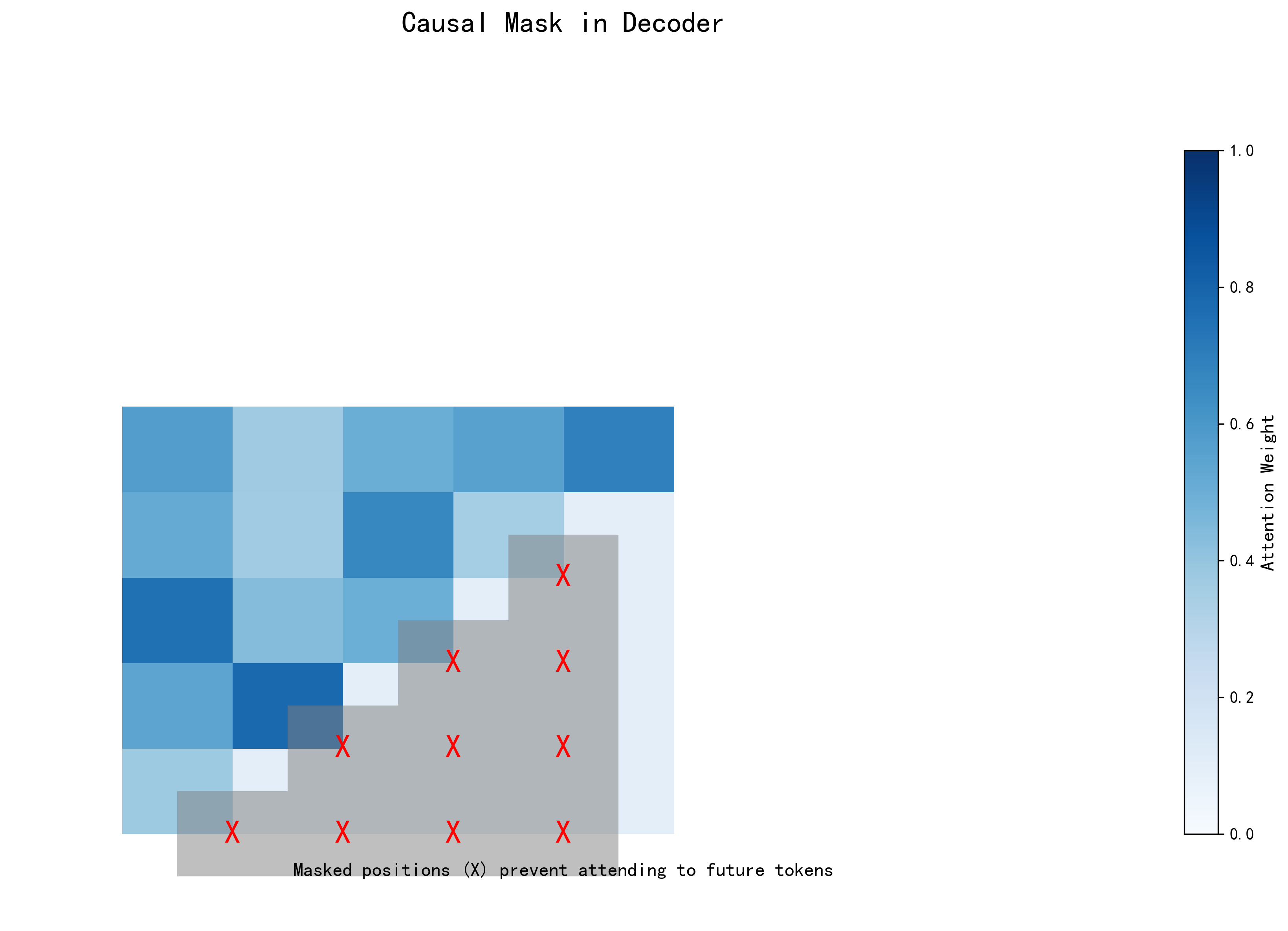- Decoder: \(N\) 层堆叠,每层 = 因果自注意力 + 交叉注意力 + 前馈网络