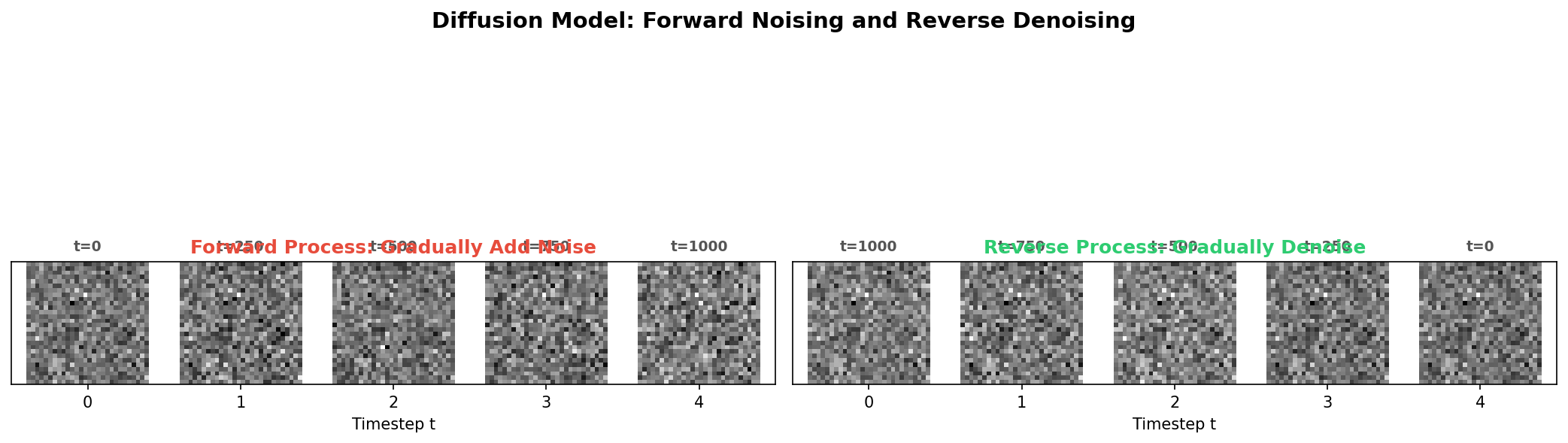 逆向过程(Reverse Process)是前向过程的"倒放",从噪声中恢复数据: