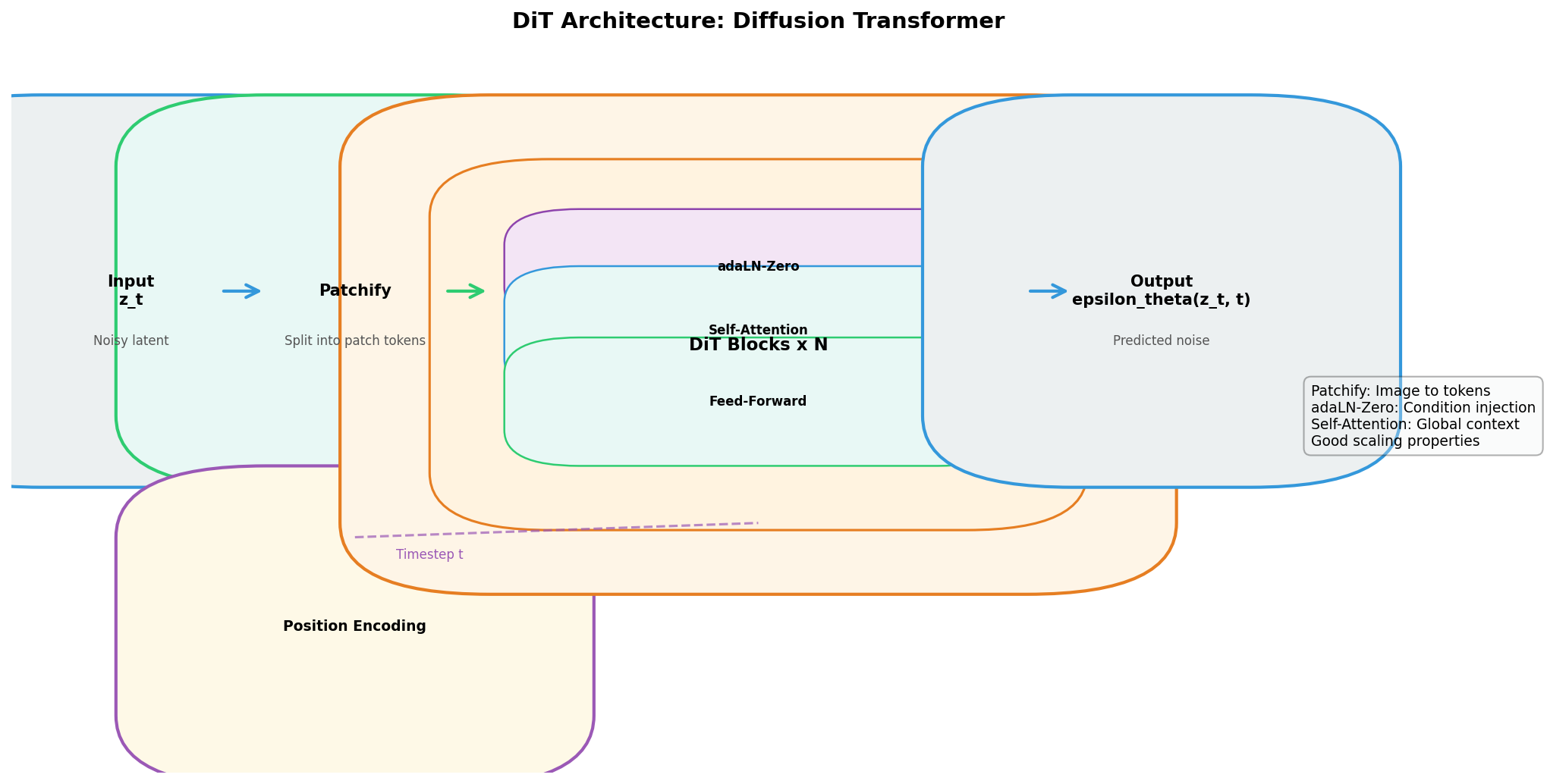 DiT用Transformer替代传统UNet作为扩散模型的骨干网络: