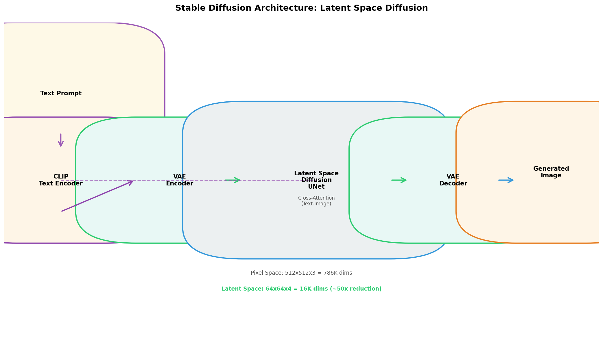优势: - 计算量降低约50倍(维度从786K降至16K) - 扩散模型专注于语义层面的生成(细节由VAE处理) - VAE是预训练的,可以跨任务复用 - 实现了高质量生成的"民主化"——消费级GPU即可运行