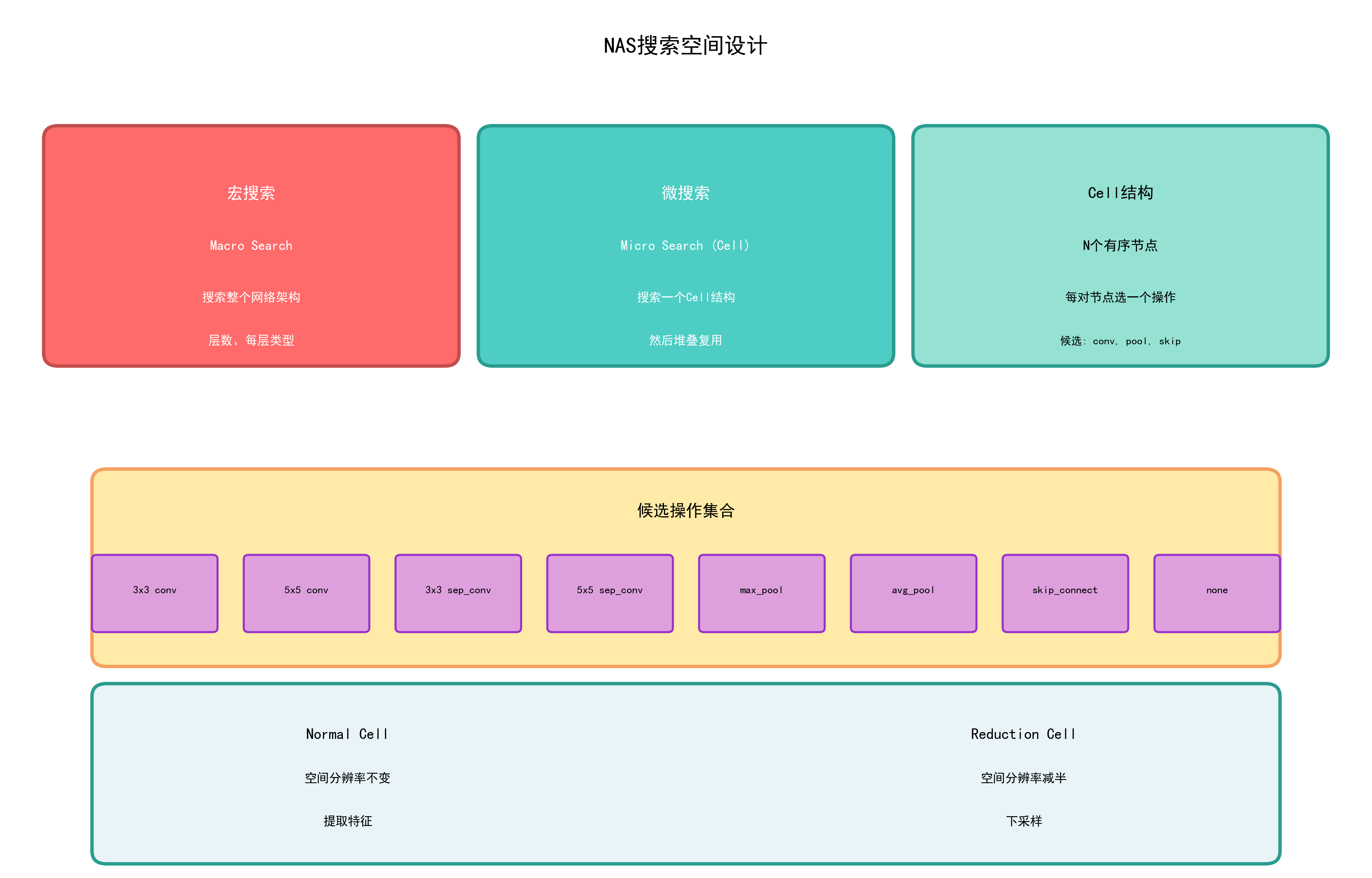 | 宏搜索 | 搜索整个网络架构(层数、每层类型) | 原始NAS |