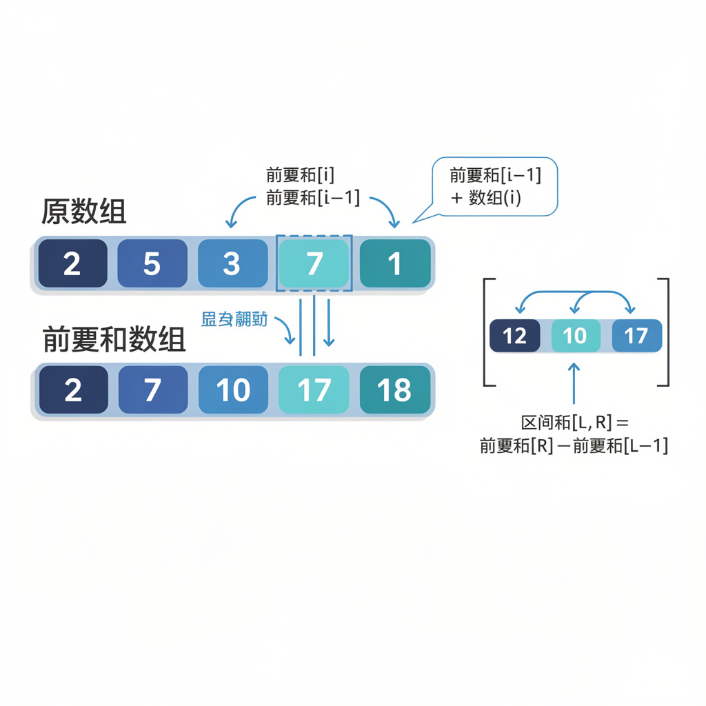 print(f"区间[0, 4]的和: {range_sum(prefix, 0, 4)}") # 1+2+3+4+5=15